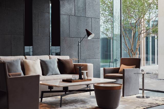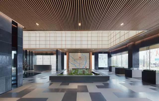 步入大廳,通過“借景”手法,將頗具詩情畫意的東方園林之景鋪呈在眼前,一抹翠綠更是讓整個空間靈動起來,巧妙而又極具視覺沖擊。在陽光照射下,投影又成為景觀的一部分,展示出自然與建筑的互動,活躍且適宜。一大排落地窗串聯(lián)起室內(nèi)外關系,正是光線的引入,讓建筑、景觀、室內(nèi)形成有序的一體。沿著預接待吧臺的動線向前穿引,便是整個銷控區(qū)域。