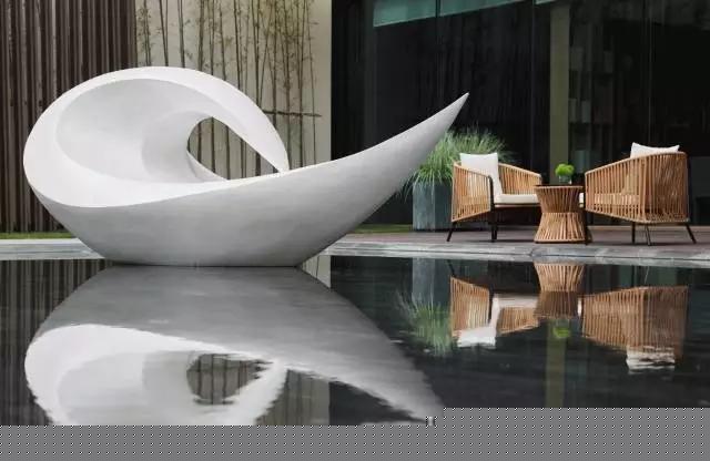 深灰色意大利火山石與柔和的沙發(fā)茶幾相得益彰,互為映襯。而光線照射進來更是活躍了整個空間,落地窗外便是庭院。水景區(qū)域一只白天鵝正在梳理羽毛,而水畔一側(cè)的休息區(qū)域更是增添了一縷閑情逸致,營造一種靜謐愜意的氛圍。