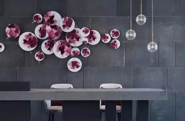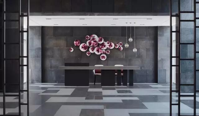 預接待吧臺與大廳講究整體的對稱平衡,通過巧妙的吧臺構成形式、空間吊燈的位置,呈現(xiàn)靈動的立面關系,有效緩解空間的呆板。大面積深灰色石材,配以紫色壁飾花瓣式鋪灑開來,夾雜一絲神秘感,東方韻味無限彌散。