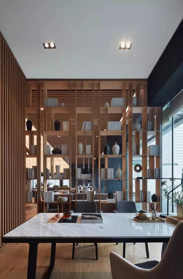 VIP區(qū)域原木色書架、豎向的木百葉有效阻隔區(qū)分空間,與周圍關系相互連接又互不打擾,形成半開放式的私密空間,整體保證了空間的互動性與獨立性。在這個“書卷留白筆墨濃”的區(qū)域,營造出靜心一隅,構筑具有人文氣息和品質(zhì)感的氛圍。