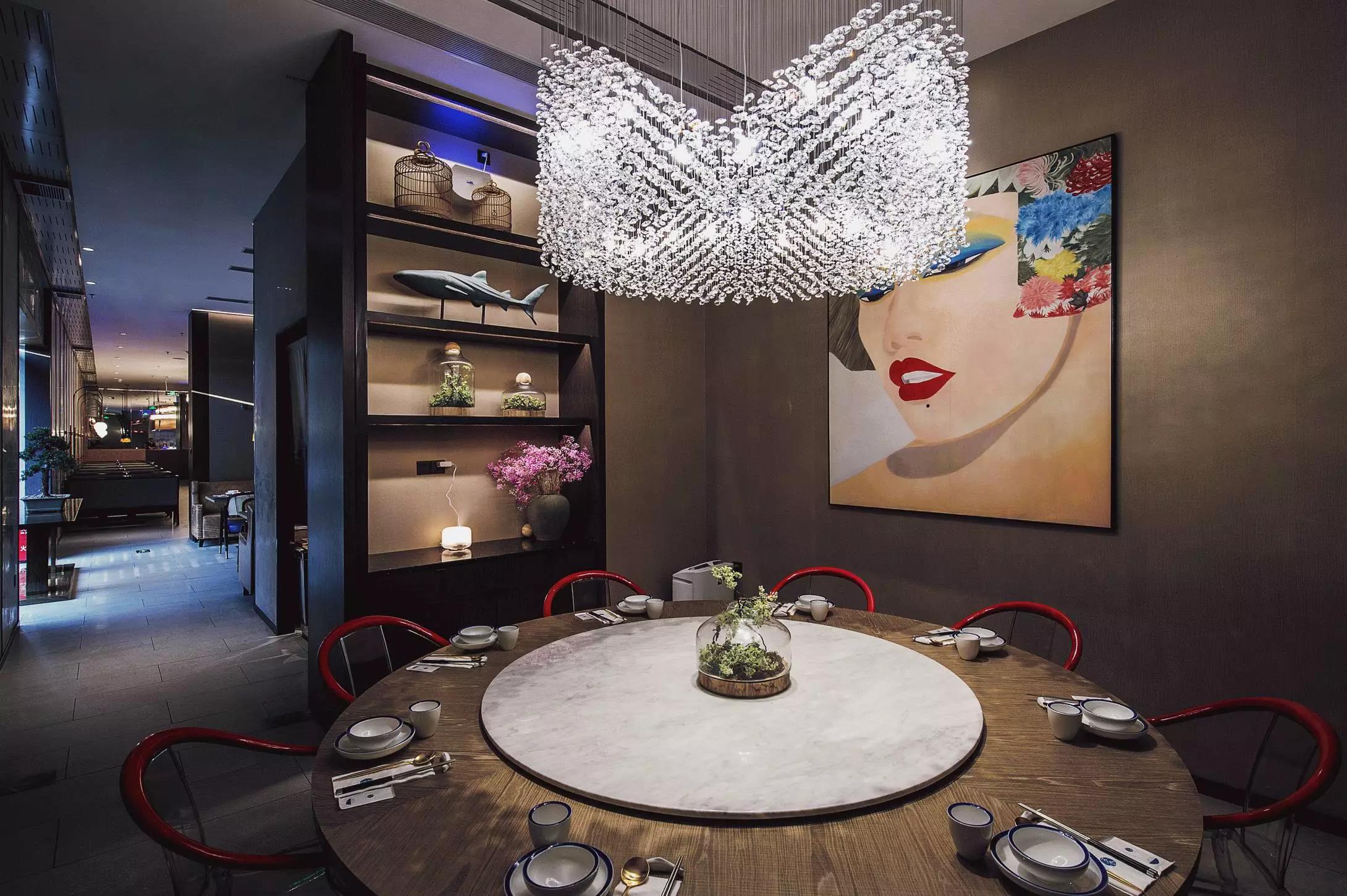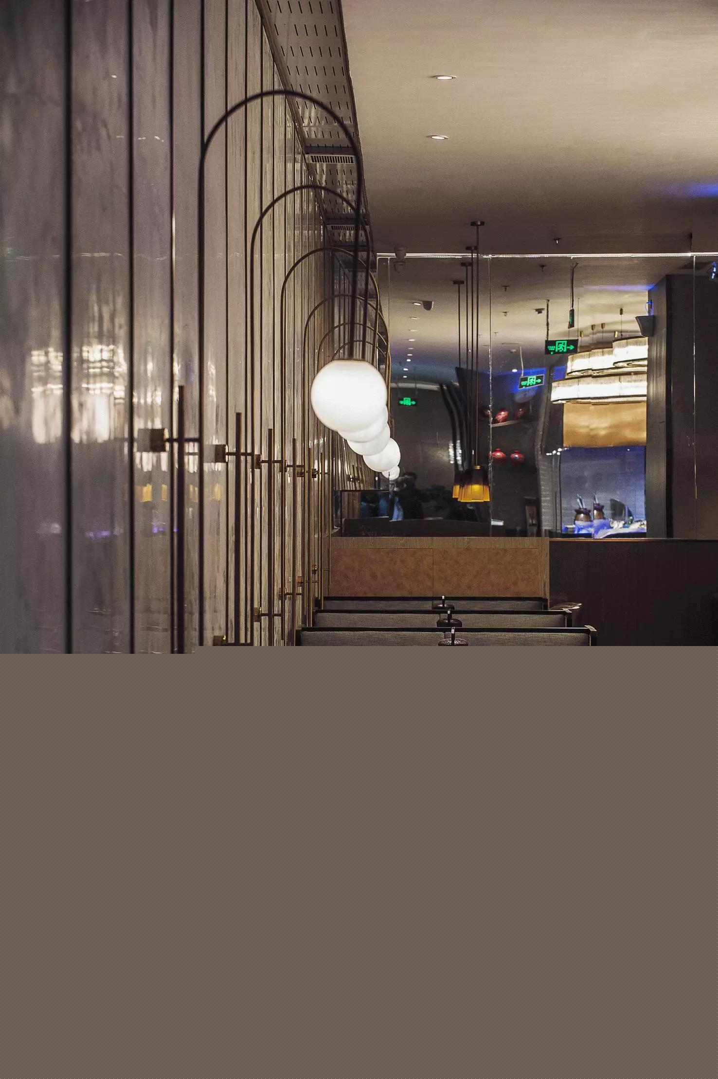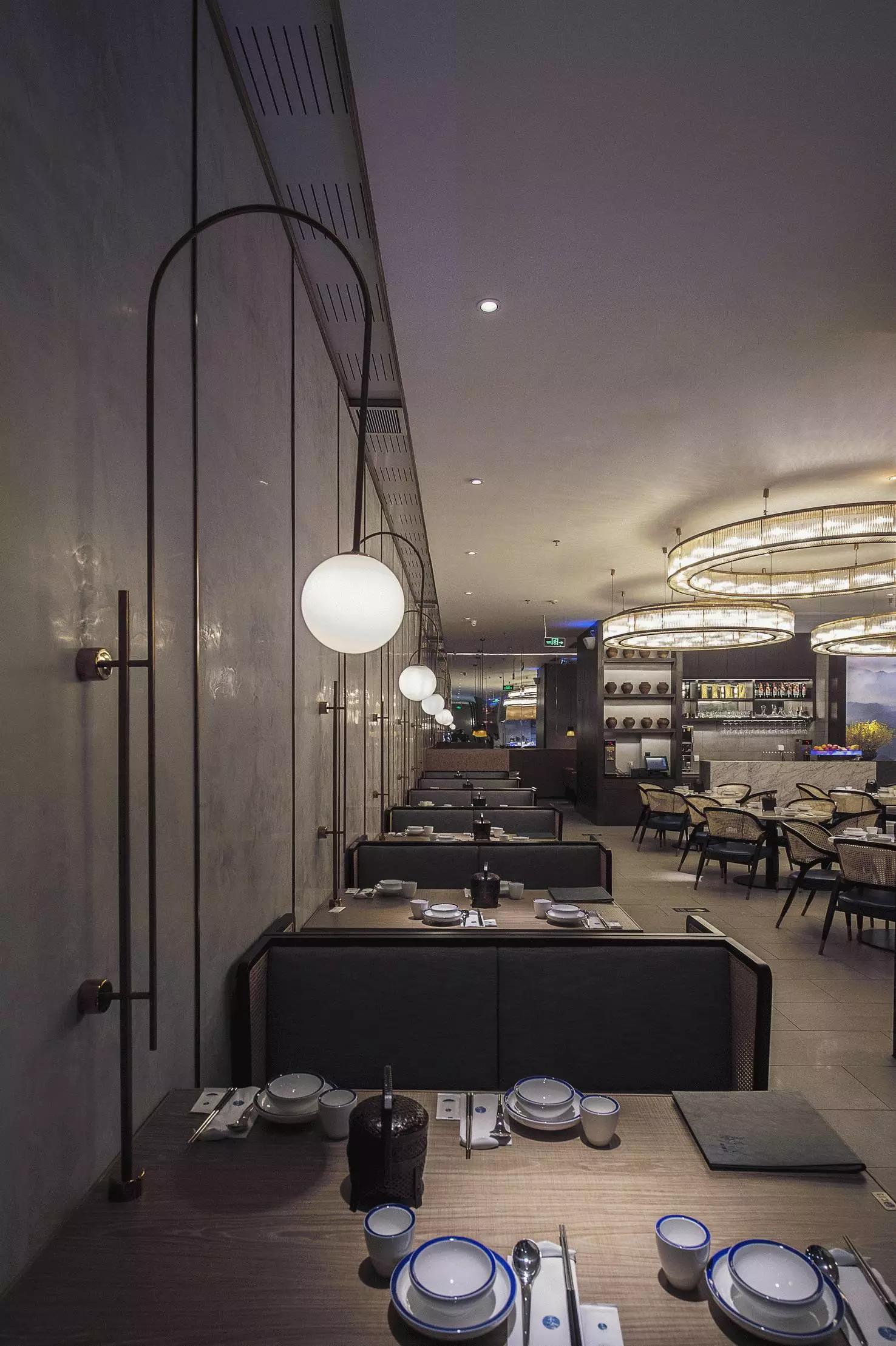 用餐區(qū)完全是一個(gè)開(kāi)放的空間,沒(méi)有很多的隔斷,圓桌和方桌有序排布,既充分利用了空間又避免了單調(diào),結(jié)合燈具的設(shè)計(jì),就像在老家庭院里的大家庭聚餐——夜晚,歸來(lái)的親人們,在清涼的月色中,你來(lái)我往,和和樂(lè)樂(lè),傳遞此間。